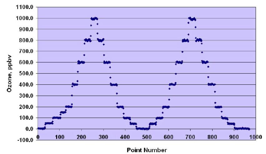 下圖是校準一臺Model 202臭氧分析儀獲得的數據,它以前已經被我們一臺可NIST溯源的儀器進行了校準,新的目標臭氧濃度每5分鐘被輸進本臭氧校準源里。從數據里可以看到,新的臭氧濃度在3個數據點(30秒)內被達到。濃度值被上上下下調整兩次以產生4條線,目標臭氧濃度是0,50,100,200,400,600,800和1000ppbv。在左側第一組樓梯上還有額外一個150ppbv的測量。
