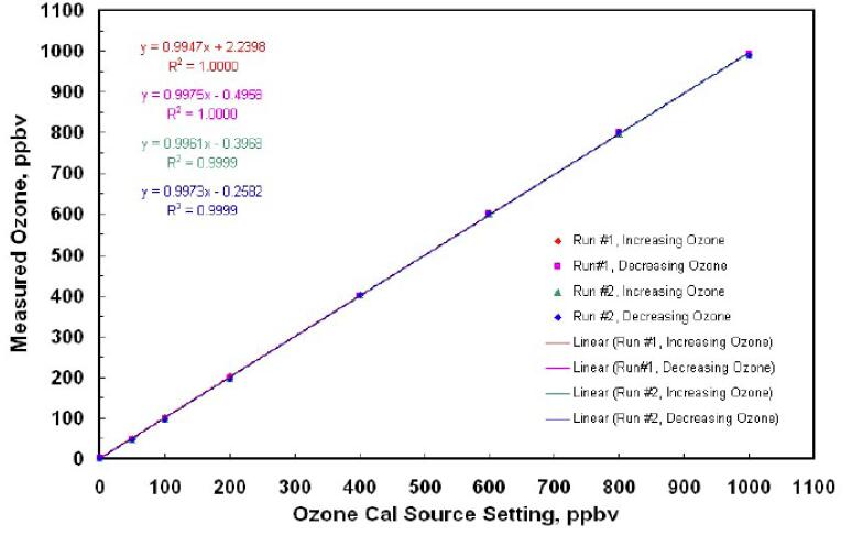 下圖顯示了從臭氧濃度增加和減少中產生的4條校準曲線。這些數據點和用 很小二乘法擬合的線,它們用不同顏色區分,重合得如此之好以至于難以分辨它們。用線性回歸法擬合的方程顯示出它們的斜率偏差在±1%,截距在±2 ppbv。相關系數都是0.9999 或1.0000。